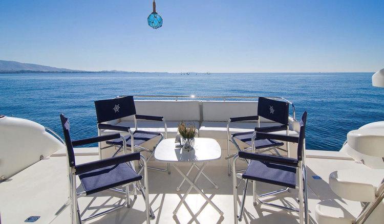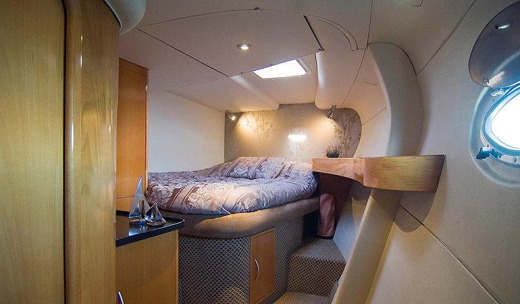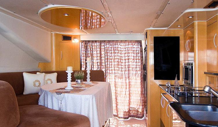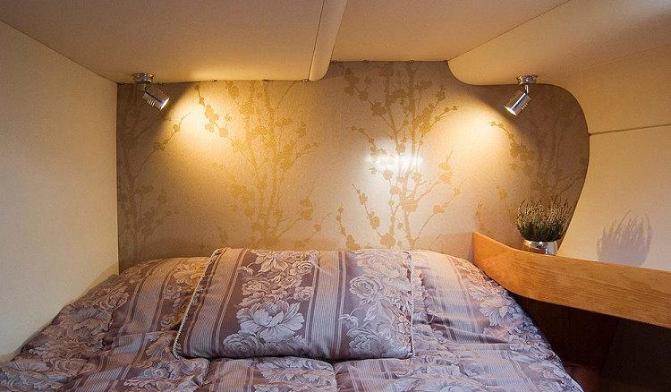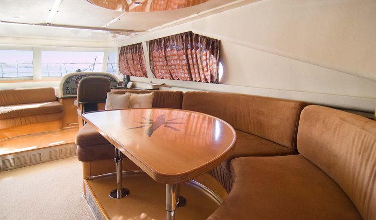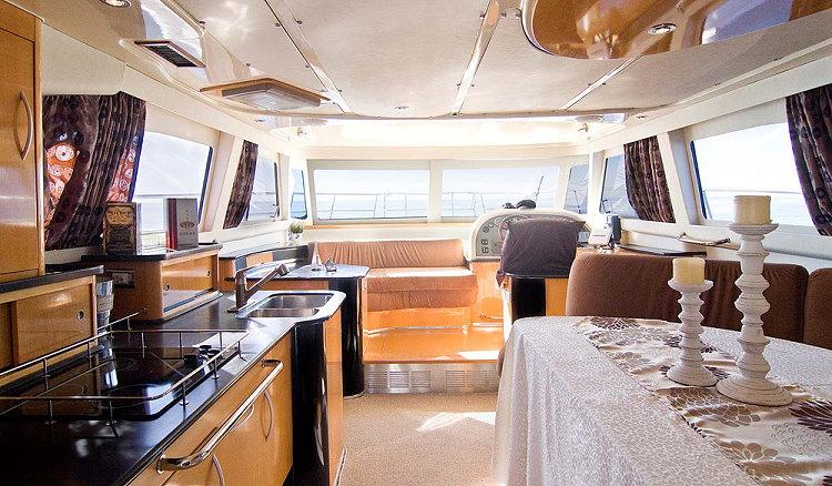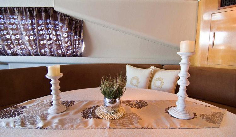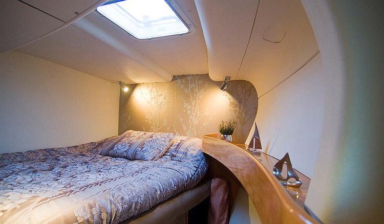 Her luminous salon has a large sofa (convertible to a double bed) a stylish dining table and a well-equipped galley with adequate storage space. She is decorated with carefully selected accessories, tableware and bed linen.